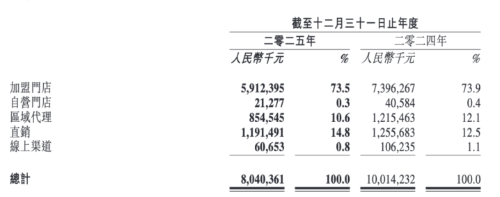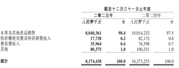 百果园集团有超98%的收入来自生果过甚他食物销售,其余收入来自特准权使用费及特准运筹帷幄收入、会员收入过甚他收入。线下门店以加盟形态为主,包括集团处理和请托处理的加盟门店。