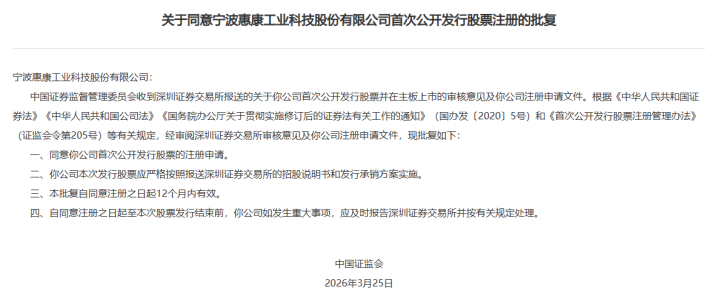 3月27日,证监会发布《对于原意宁波惠康工业科技股份有限公司初度公设备行股票注册的批复》。据悉,惠康科技拟在深交所主板上市,财通证券为保荐机构,拟募资17.9655亿元。