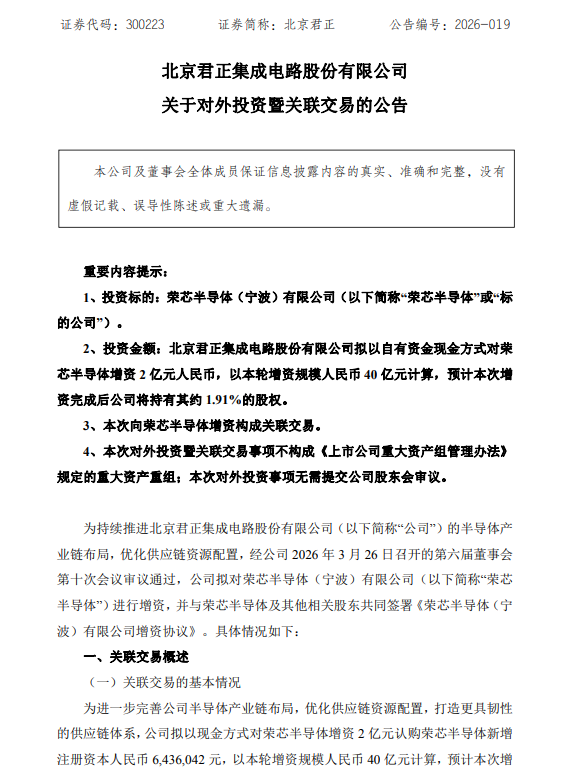 3月27日,北京君正(300223.SZ)公告称,公司拟以自有资金2亿元对荣芯半导体(宁波)有限公司进行增资,Z6尊龙凯时官方网站认购新增注册老本643.6万元。按本轮40亿元增资限制揣度,增资完成后公司将执有荣芯半导体约1.91%股权。本次对荣芯半导体投资属于公司对半导体上游供应链的布局,有助于公司更好地拓展上游供应链资源。
