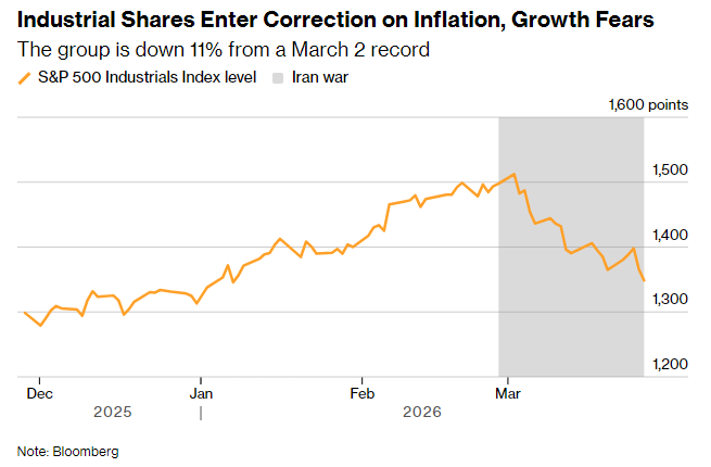 好意思国主要工业与输送类股集体进入本领性退换,跟着中东战事抓续对经济的影响激励阛阓日益担忧,这一走势为总共这个词好意思股大盘亮起红灯。