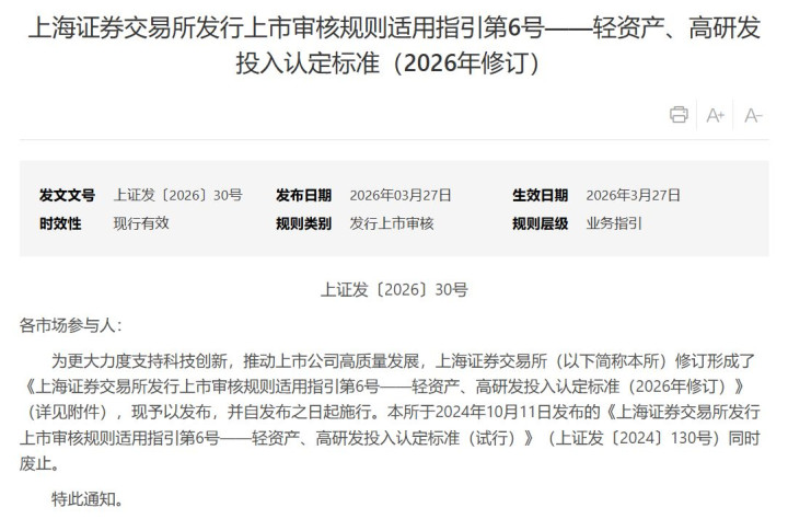 当天,上交所发布了新创新的《上海证券来往所刊行上市审核递次适用指挥第6号——轻钞票、高研发进入认定模范》(以下简称《6号指挥》)。