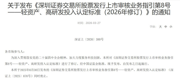 与此同期,深交所当天在官网发布了新创新的《深圳证券来往所股票刊行上市审核业务指挥第8号——轻钞票、高研发进入认定模范》(以下简称《8号指挥》)。