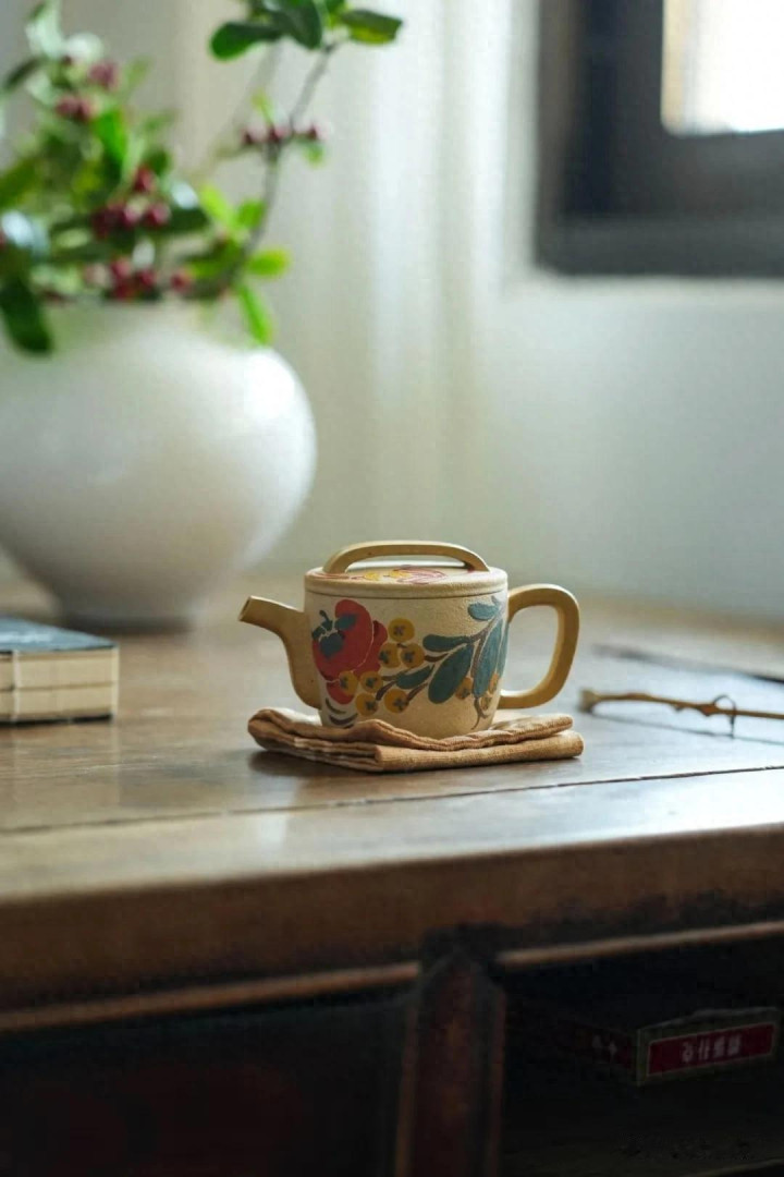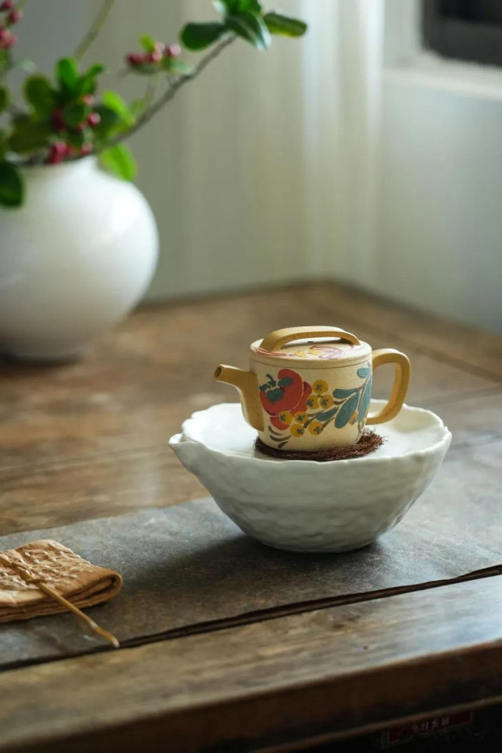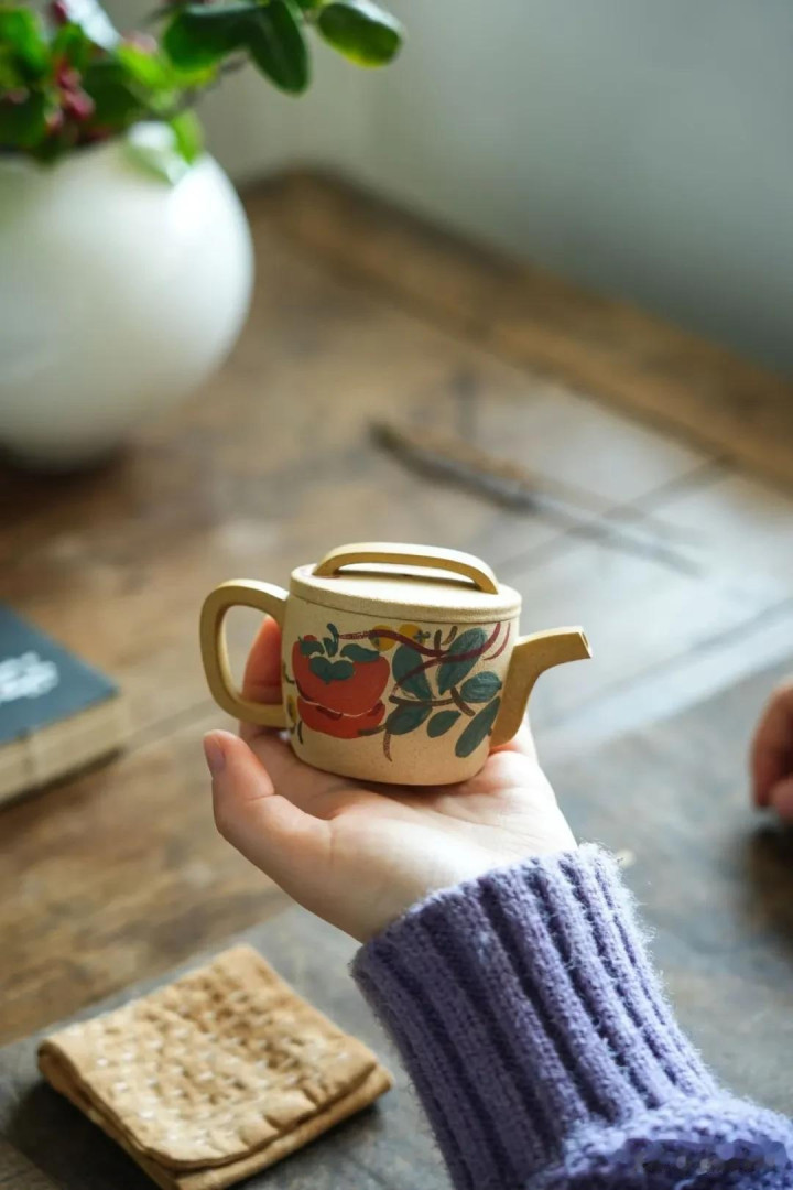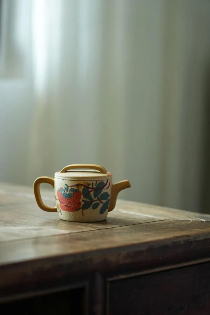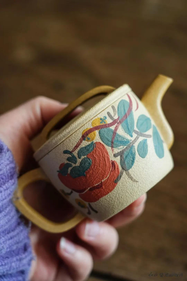 紫砂壶的人命在平淡使用中开放。晨起煮水时,我可爱先用开水表里淋烫壶身。鹅黄段泥气孔绵密,遇热舒展如呼吸,壶壁逐步沁出琥珀色包浆。投茶注水间,柿子彩绘随热气微微晕染,竟生出几分活色生香的意趣。