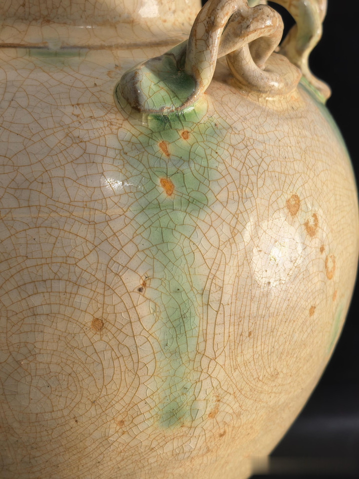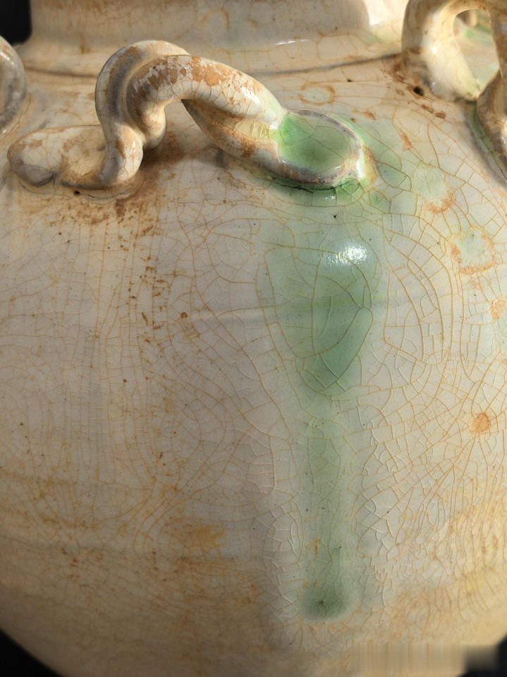 本日呈目前咱们目前的这件隋代白釉点绿彩十系罐,号称最具代表性的器物之一。于生手而言,它看似质朴无华;而在行家眼中,其中所蕴含的门谈皆为国宝级的寥落信息。