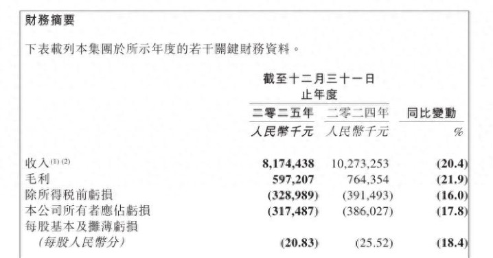 财报知道,百果园的收入由2024年的102.73亿元减少约20.43%,至2025年的81.74亿元。集团的毛利由2024年的7.64亿元减少约21.9%,至2025年的5.97亿元。公司归母净耗费收窄,为3.17亿元,同比减少约17.8%。