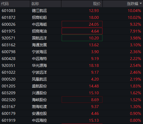 海运股拉升,锦江航运、招商汽船直线涨停,中远海能冲击涨停。