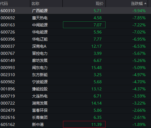 电力板块集体下挫,广西动力(维权)涉及跌停,中闽动力、晋控电力、闽东电力、华电辽能均跌超5%,豫能控股、韶能股份、江苏新能跟跌。
