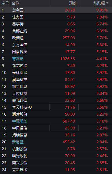 算力租借看法再度活跃,奥瑞德11天6板,宁波建工涨停,宏景科技涨超10%,优刻得、皆门在线、顺网科技、佳力求等跟涨。