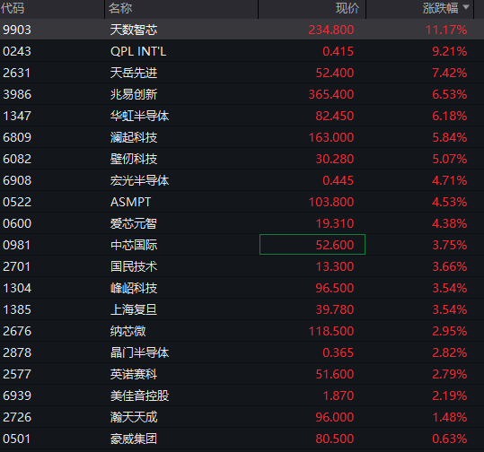 港股芯片股集体冲高,天数智芯大涨近12%,华虹半导体、壁仞科技涨近6%,中芯海外、上海复旦涨超3%。
