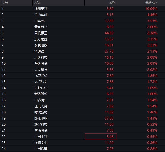 大基建板块反回生跃,神州高铁3连板,朔方海外一字涨停,中工海外、晋西车轴涉及涨停,铁拓机械、金鹰重工等跟涨。