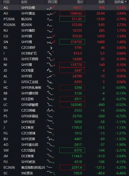 商品:国内商品期货普涨,畛域发稿,沪银、沪金、钯金、铂金等涨幅居前,焦煤、焦炭、燃油、原油等纷纷下降,集运指数跌超7%。