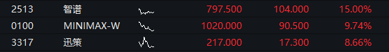 港股AI利用股走强,智谱涨15%、MINIMAX-W涨9.74%、迅策涨8.66%。