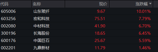 玻纤看法快速拉升,山东玻纤贴近涨停,海外复材涨超10%,中国巨石、中材科技跟涨。