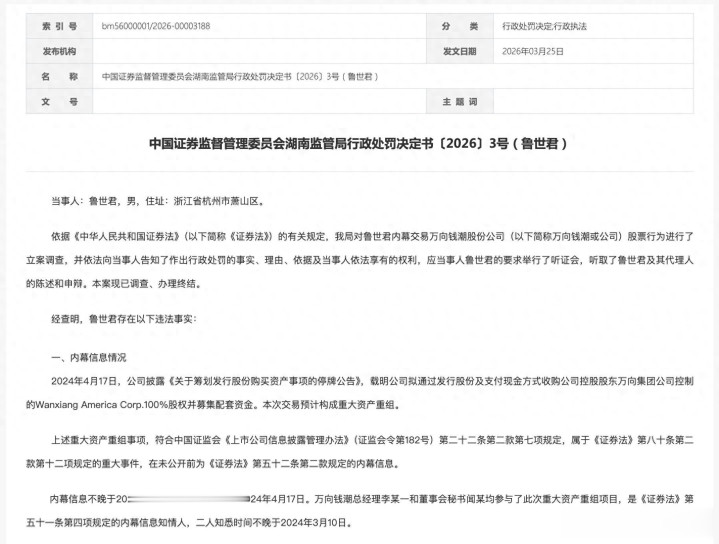 2026年3月26日,一则来自证监部门的行政处罚决定书,将“大家万向节大王”万向钱潮再次推到了公论的风口浪尖。鲁世君因涉嫌在万向钱潮紧要财富重组期间进行内幕往复,被处以充公行恶所得并处以高额罚金,单东谈主罚没悉数超1800万元。